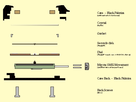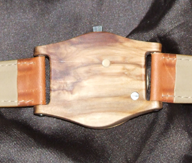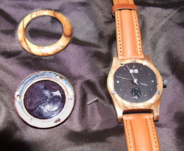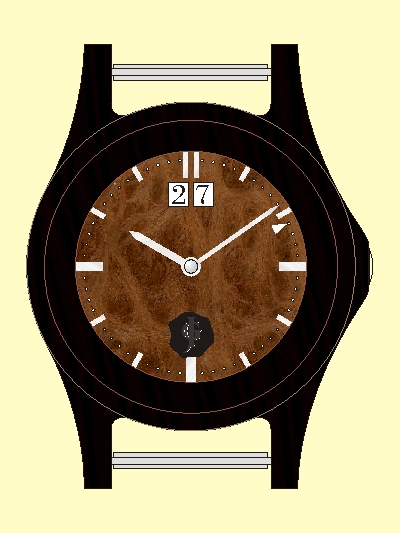 There were a number of obstacles to overcome but the basic consept seemed sound. How to fix the bezel and how to change the battery were two of the most pressing problems. The battery is at the back of the movement so that had to have access (even though it might only be every three years or so). A sliding cover set into the back was conidered but cutting this from the back and still keeping the grain of the wood intact would not be possible and the use of a separate material was not an elegant answer. To take the movement out from the front was the best solution but that required the crown and stem to be removed. To remove the stem one needs to depress a catch which is only accessable from the back of the movement, so it became necessary to drill a hole in the case back exatly in line with the catch in the movement. Further, this hole would have to be covered to prevent ingress of foreign matter. Fixing the bezel didn't cause quite so many hoops to be jumped through but accurate machining would prove to be imperative. The solution was to make a stainless steel ring 0.5mm thick with three 'keyholes' at 120° and glue that into the bezel. This would locate on three Stainless pins with 1.8mm Ø heads and 0.8mm Ø collar. I considered 8° of turn sufficient but now think that 30° would be better. 8° would locate the bezel successfully but the potential for it to come loose while on the wrist was too high to leave as the only fixing. Another hole 0.9mm Ø was therefore drilled into the ring after it was locked in position with the three pins. A 3mm Ø recess was also cut into the case from both front and back using the 0.9mm hole as a guide and a 10BA screw with 0.9mm Ø pin made to lock tight into the case and protrude through the ring.  |