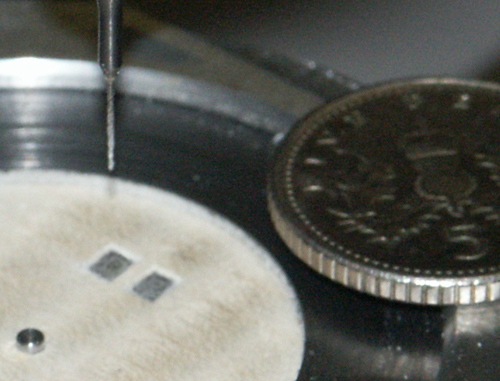 To give a better sense of size, this shows the 'Big-Date' windows relative to a 5p coin. The drill is 0.3mm dia.  |