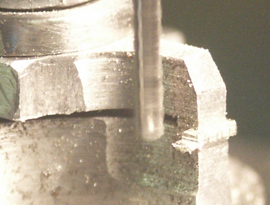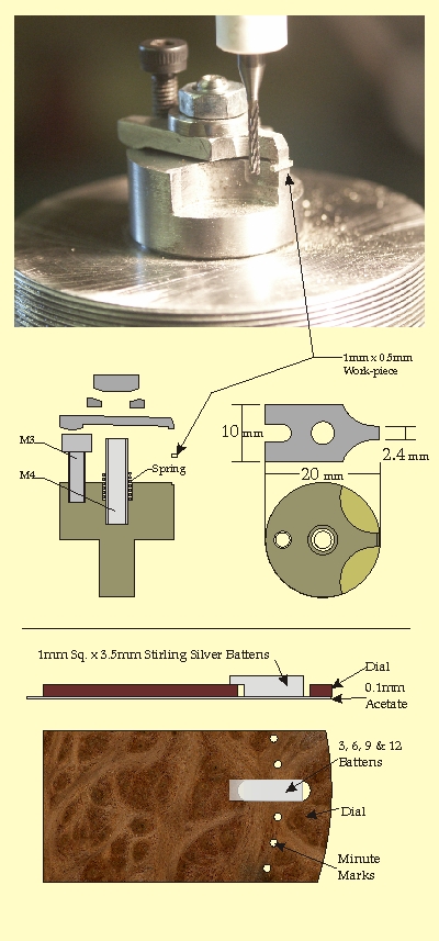 This is the 'Vice' I've made to mill the Battens from 1 x 0.5 mm Nickel-Silver. The cutter is a 1.15mm solid carbide slot drill which I run at 20000rpm taking cuts of 0.01mm trimming the length of the batten to 3.5mm for 3,6,9 & 12 and 2.5mm for the other hours. The Nickel-Silver I get is only nominally 1mm wide - in fact there is a cutting 'ridge'down each side making it about 1.05mm which has to be trimmed off. The short hour battens then have to be reduced to 0.6mm wide so that they don't stand proud of the dial. I also intend to use this 'vice' to trim Ebony and various other hard woods where the need for contrast with the dial needs something other than 'silver'. June 6th 2006 I've now found a source of 0.5mm Sq and 1mm Sq Stirling Silver which I will use instead of the Nickel-Silver - the 3, 6, 9 & 12 markers coming from the 1mm and sitting 0.4mm proud of the dial and the other hours from the 0.5mm set 0.3mm into the dial therefore sitting 0.2mm proud. All the battens will have to have a rebate cut out of them to cover the radiused hole created by the cutters of course.  |