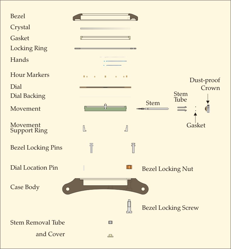Back view showing bezel locking screw and stem removal tube cover.  |