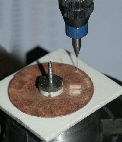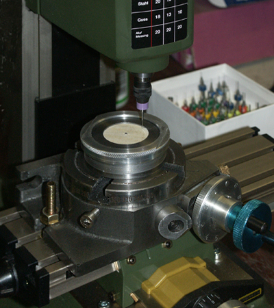 Drilling 0.3mm dia holes in the dial to mark the minutes. This is the Mk 1 version of the jig to hold the Dial Blanks in position. Locating on a 10BA thread and using a 2mm thick plastic washer and a nut. This method has the disdvantage of tending to lift the outside edge of the dial thereby making the veneer 'tear' rather than cut. The original thinking behind his design was that batten 'slotts' to break the edge but on reflection that is in itsellf a disadvantage. The Mk2 version is shown below. The centre locating peg has been reduced to 1.5mm dia x 1mm high in the centre of a 50mm dia boss with a 0.7mm pitch thread plus a mating clampling ring which takes an insrt to suit the diameter of the dial being made. The grip on the outside edge is 0.5mm but it does hold the blank flat and I can mill to the diameter of the crystal which is more than sufficient.  |