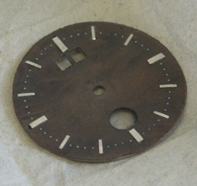 This is a Sycamore dial when all the milling work is complete but prior to the filling of the minute holes and battens.  |