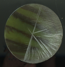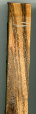Vera - Lignum Vitæ (Bulnesia arborea) 69mm x 22mm. A dense (1100Kg/m³) Colombian grown timber. Olive green to brown, waxy with self lubricating qualities. Image shows both face and edge since the potential figuring on the finished watch cannot be evaluated from the face alone. |