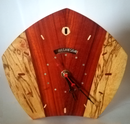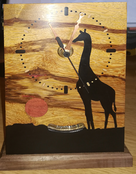 I had been enamoured of a photograph of an African Sunset which had a Giraffe in shilouette, this, coupled with the memory of a piece of Marble Wood I'd bought some while ago, started the creative juices flowwing which resulted in a 'pictorial' clock using Ebony & Padauk. |