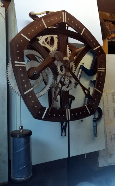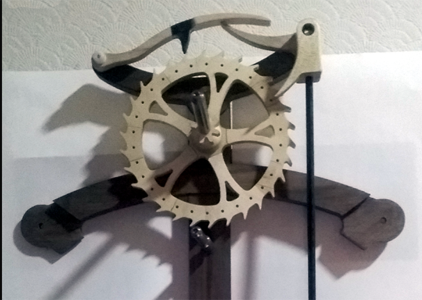 It is now July 2023  and I haven't updated this site for quite some time! I have, however, been designing a number of 'time-pieces' and some have been partially made but I recently actually completed one project and am close to completeing yet another. Many projects have fallen by the wayside simply because they didn't stand up to the scrutiny of the real world even though on the drawing board they looked more than viable. Some simply relied on small electric motors which turned out to be less than totally reliable, even with the addition of voltage control. One particular example perported to run at 100rpm from 6v - all the design work & calculations were based upon this premise but when the 6v was applied, it became obvious that it was running at more like 120 rpm. by adjusting the voltage to 5.2v I did get somewhere close but it became very temperemental. Not what I needed when the design had a scale model of both the Earth and the Moon attached. The Earth rotating on a 23.5° axis and the Moon taking 27.327 days to rotate once to within 20 seconds per year. This project made me somewhat deflated and it remains incomplete. Another project came to life after I read an article about Galileo's work on the Pendulum. The escapement he created looked simple enough and by now I had aquired a CNC machine which made the creation of complex shapes very much easier. I had also discovered the Reuleaux Polygons and I designed quite a large wooden clock incorporating both. Using a full length (1m) Pendulum made from Carbon Fibre, a Reuleaux Pentagon dial and a 2.5kg solid Lead driving weight. The idea was to make 4 of these to gift to some of my family. I did have one running for some hours but after a minor cosmetic ajustment it refused to perform for longer than a few minutes. Again, becoming dis-illutioned, all four remain languishing in a box awaiting some inspiration to take hold! Here's a photo of the one fully assembled and another of the Escapement  |