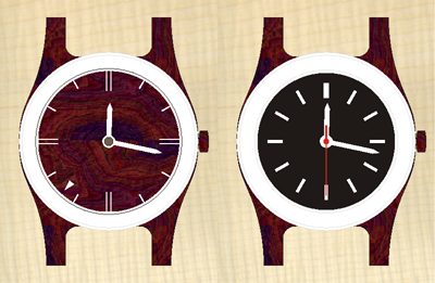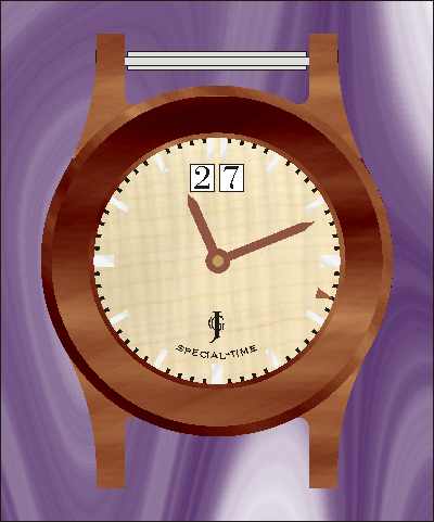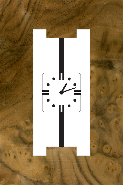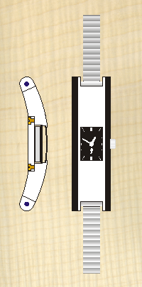 This design uses a man-made Tortoiseshell alternative to house a Citizen Quartz 'Big Date' movement. The seconds hand is a simple pointer on a clear Plexiglas® disc. The Hour markers are Nickel-Silver and the minutes are 0.25mm wide slots cut into the Rippled Sycamore dial filled with Garnet Shellac. May 2006 The 'Big Date' Movements are ordered but delivery is currently unknown due to it being a very new Movement from Citizen. When they arrive the first watch using them will be Black Palmira with Shark-skin Strap, Stainless Steel Deployant Clasp and Orange Swampwood Veneer Dial. The Citizen/Miyota 1M52 movement hs now arrived so click here to see the construction progress.  |