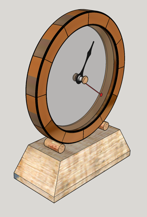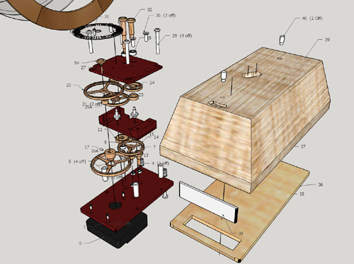 knowing her flare for design I wanted her to have some input. When she came back with "Something modern with Stainless steel and/or brass . . . Oh, . . . it would be nice if you could see the movement" . . . I had to take a step back and re-think. My intial thoughts were that 'Skeleton Clocks' take a serious amount of time to manufacture and although a wooden skeleton clock was my original inspiration for getting into this field of endevour the idea that I could even attempt to make one before July 2007 was inconceivable Shortly after this a 'flyer' came in my post and dead centre on the front was a skeleton clock movement ready made complete with dial/hands/case which I could quite easily incorporate into a new case of my design. I bought two (just in case) and proceded to investigate the best way to extract just the movement. Within 15 minutes I had destroyed the first - but I now had no compunction about taking the whole movement apart. I knew it was a quartz movement but was surprised to see how simple the driving force was. Thoughts now turned to the posibility that I could make a quartz unit with a solenoid acivated each second and drive my own gears - the fact that I didn't have any knowledge of quartz crystals or a means of making gears was secondary - there now seemed a way that I could in fact conform to all the criteria that had been imposed upon me! As an aside, I'm amazed to find that this cheap skeleton movement is keeping extraordinary good time - after three weeks the second unit is about 2 seconds fast. I now set about investigating quartz crystals and solenoids but quickly found that 'experimental electronics' is all but dead in he UK and any components that I might get were going to be 'silly money' or from the USA (with all the problems that would entail). It occured to me that I already had access to a ready built quartz movement and not only that it was a radio corrected one (as used in 'The Giant'). It seemed that instead of puting a hand on the minute spindle I could put a gear and that could then drive a train essentially 'reverse engineering' all the hand movements. There would be issues of friction and torque but if I took all measures to minimize the friction then the amount of torque available would not be a problem. Friction is caused by rubbing between mating components and under normal conditions gearing ought to be in constant contact to reduce 'backlash'. In clocks of course backlash is not a problem because power is applied in only one direction (even in those which are designed to run backwards) so actually designing to include extra backlash (space between gears) is perfectly acceptable. After many hours drawing gears of appropriate ratios and suitable 'skeletal' plates to hold them in place I have now created my third design which I am now preparing to manufacture.  |